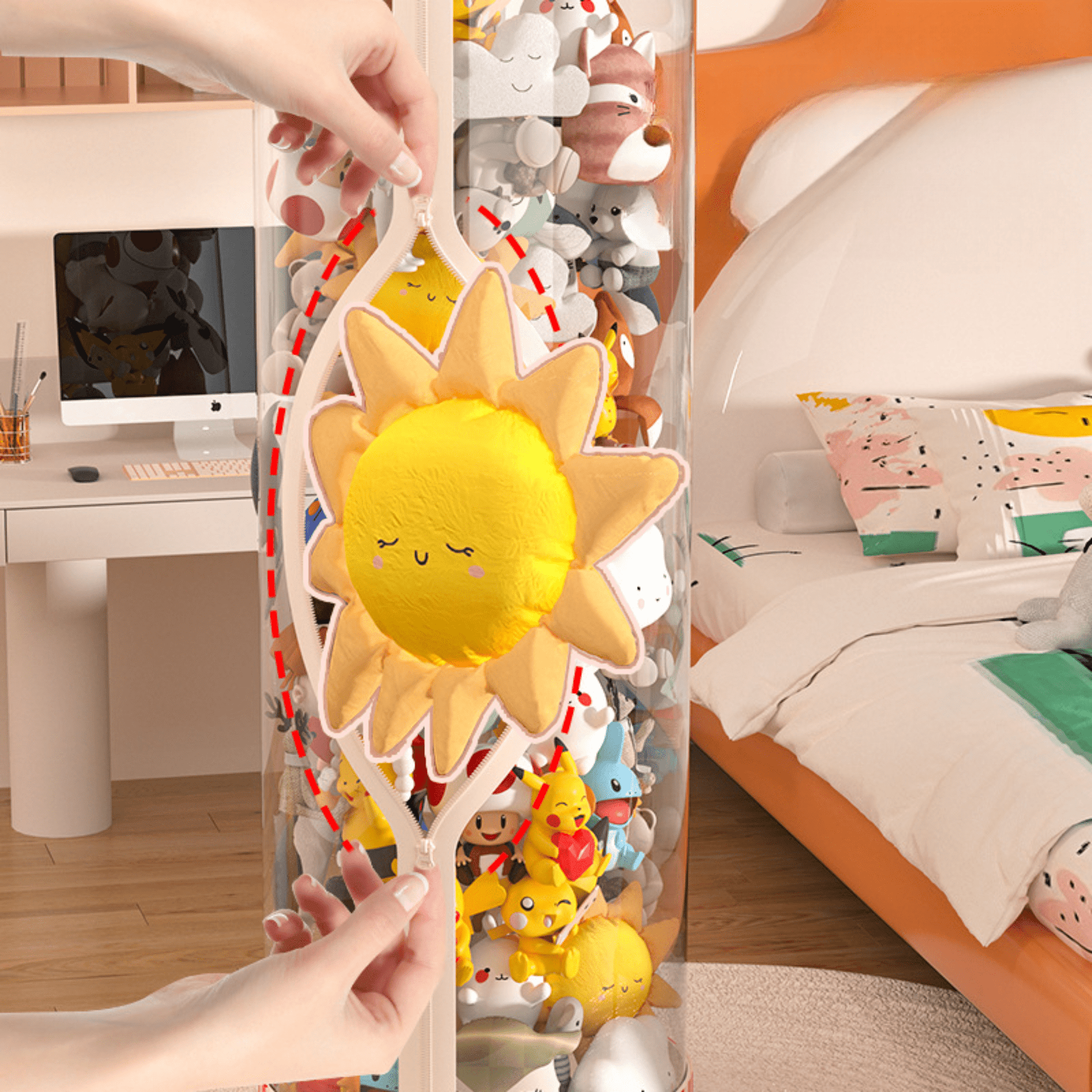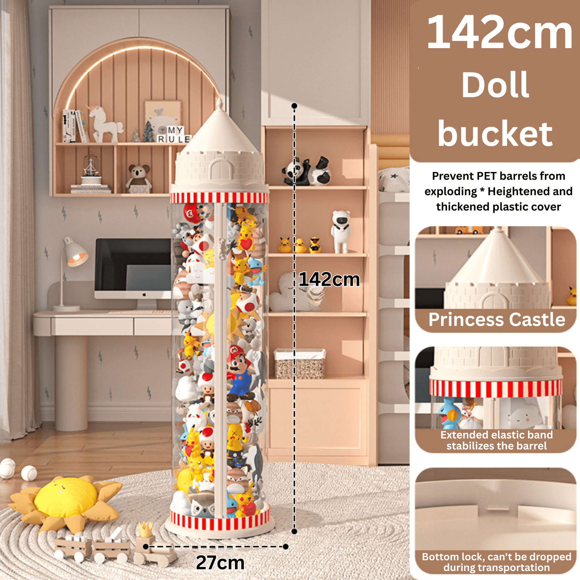 Keep your child's plush toys neatly stored with our transparent doll storage bucket. Made from clear, durable plastic, it features a princess castle design, a two-way zipper, and a triple-reinforced body for added safety. Ideal for organizing dolls and soft toys in style.